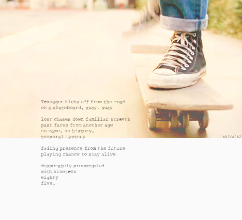 This was inspired by a wave of photo edits on Tumblr done in a similar style — in particular, I liked the aged textured look some of them had, and the use of large ellipses as layer masks. So this was my attempt at doing something like that. The text comes from the song 'Back in Time' by Huey Lewis and the News, which was written for and featured in the first Back to the Future film.