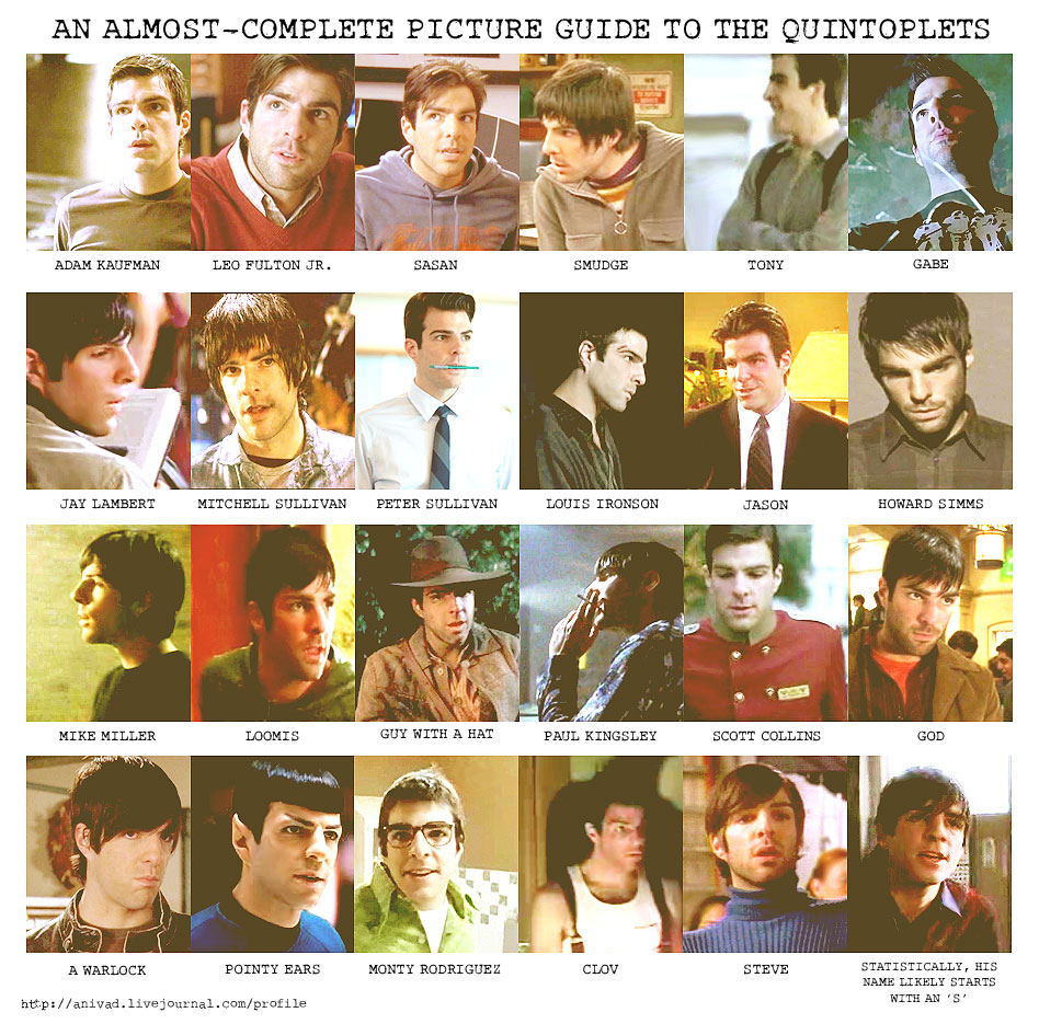A set of promotional posters for the film Inception had each feature one character and their respective role - 'The Extractor', 'The Point Man', 'The Architect', and so on. A friend of mine got the idea to do a version of that with Michael J. Fox, and created a single gif that featured four of his characters. I was inspired by that to do a version for Zachary Quinto, but as a gifset and with different role names than those in Inception. So I did, and named it Inzachtion, because I have a thing for terrible puns.