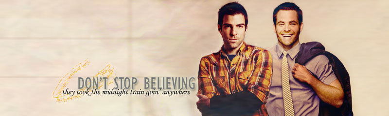 I made this banner for a friend as part of a Christmas exchange at a fan community dedicated to Chris Pine and Zachary Quinto. She gave me two pictures (or links to two photosets; I can't remember) of Chris and Zach respectively, and requested I make a banner out of it which she could use for her blog. So this was what I came up with.