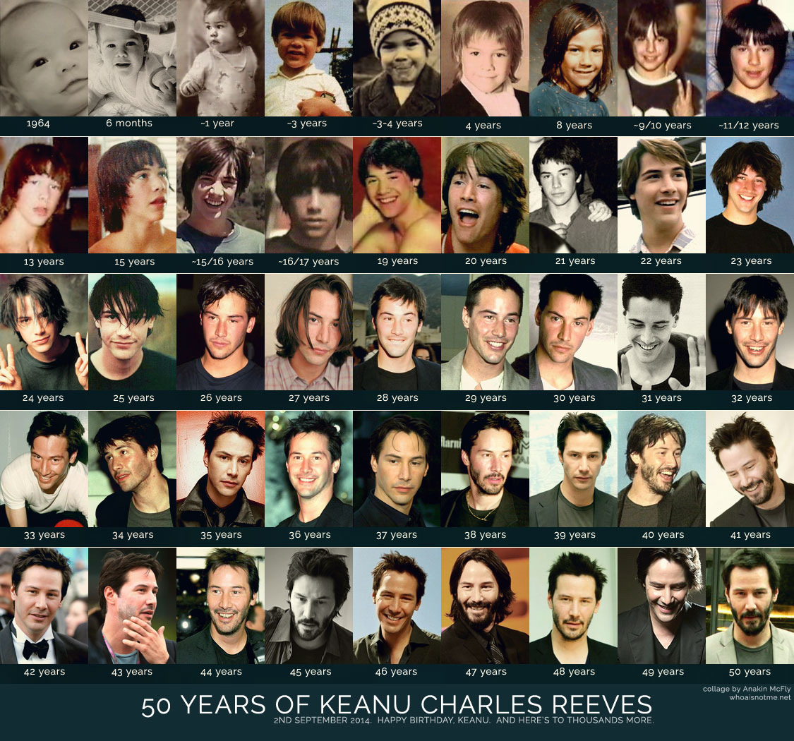 I made this collage for Keanu's 50th birthday, showing him aging (or not) through the past half century.