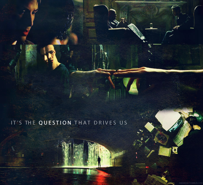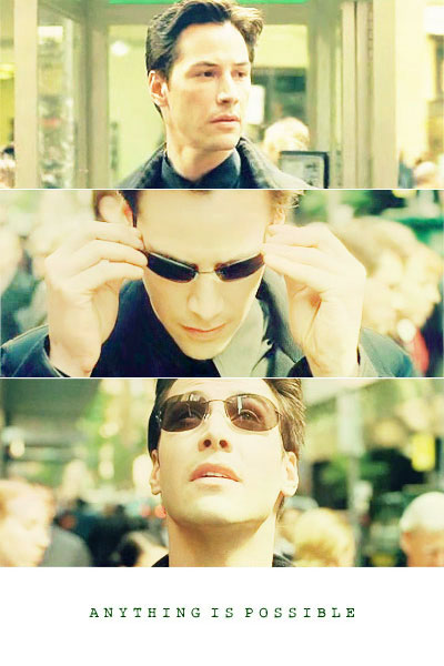 The Matrix is my second favourite movie in the world, and also changed my life; that just happens a lot. This was a mashup of various scenes which I thought defined the feel of the film, whose aesthetic I really like. (Click '+' to enlarge.)