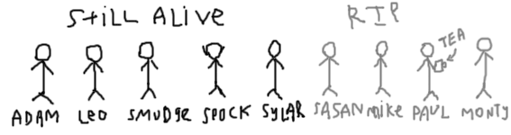 Leo remembered quiet moments. Adam hacking on the laptop. Sasan and Smudge cuddling on the couch. Spock narrating a log into the silence of the void. Tony hanging around picking fights with Smudge. Mike watching them, hesitant. Picking up cheese from a corridor floor, filming a video, sharing meals in an empty cafeteria, huddled around the television, cheating death, running, hiding, always sticking together as their numbers dwindled from the threat of the watchmaker...