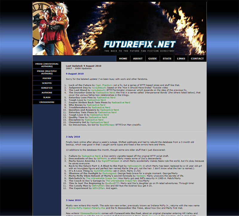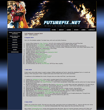 FutureFix (previously 'The Back to the Future Fan Fiction Directory') was my first web project, after I thought it would be a great idea to collect all the Back to the Future fan fiction around the Internet and make a directory of them. It took me two weeks to compile the initial lot of entries, after which I maintained a fairly steady monthly updating schedule.