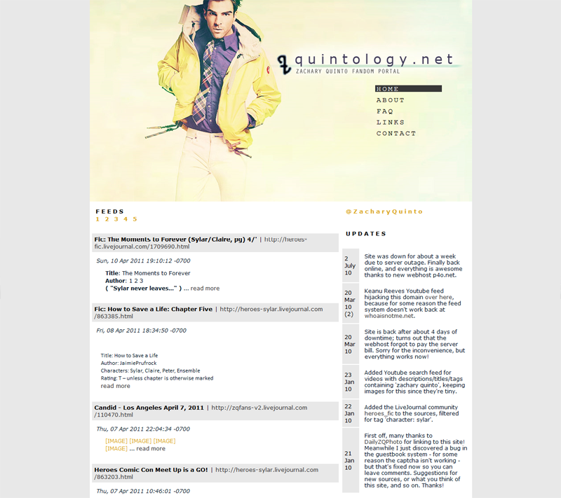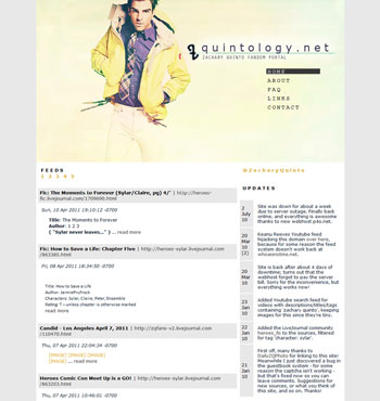 Quintology was a really lightweight website, built after an instant message conversation with a friend – where I'd remarked that 'Quintology' would be a brilliant name for a Zachary Quinto fansite. "Do it!" she said, and so I did, and launched the site three days later.
