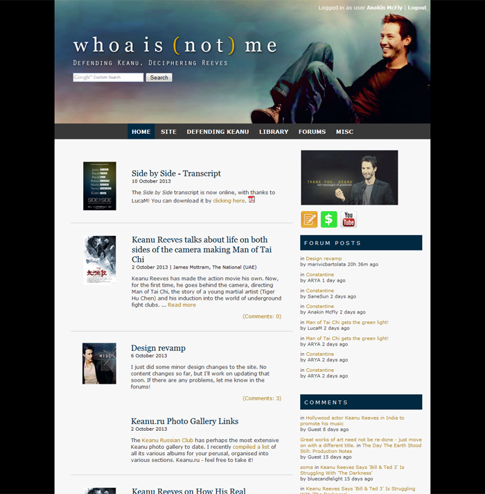 As of September 2015, WINM has about 600 members in an active and vibrant community. The site aims to be a comprehensive archive of all things Keanu, and to that end includes a full directory of Keanu’s film, TV and stage work, a character database, a scripts archive, a collection of music from his band, the Reddit-originated Thank You Keanu project and a helpful instruction page on how to spell 'Keanu'.