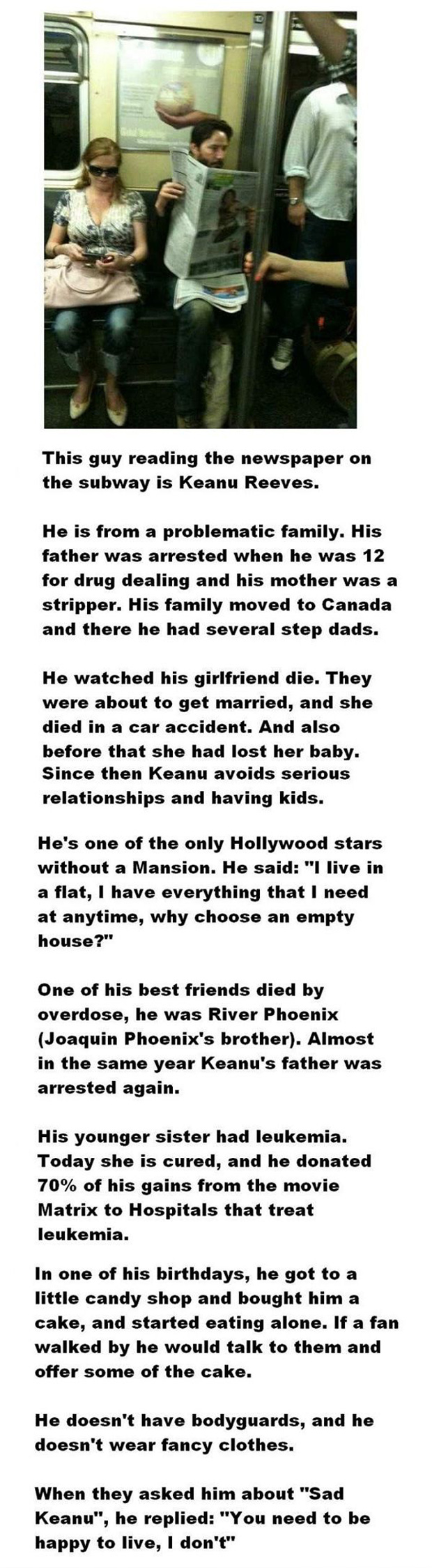 A: Yes and no. It's full of weirdly exaggerated or inaccurate facts. Yes, that is Keanu on the subway. His mother was not a stripper, she was a showgirl. He did not watch his girlfriend die, because she was the only one in the car when it crashed. They weren't about to get married; they either were about to break up, or had already done so, depending on who you believe. Yes, before that she'd lost her baby when it was stillborn.